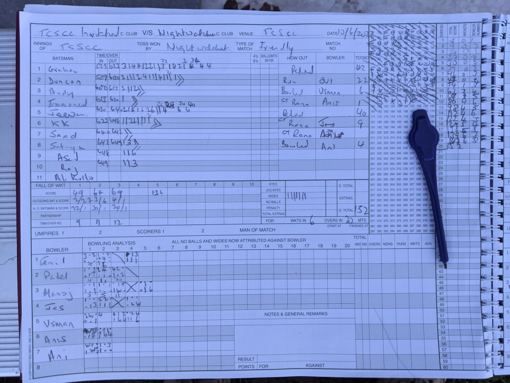 The Nightwatchmen CC innings was fairly straightforward thanks to a blistering opening knock by Ketan (40*) backed up ably by Will (13) and Raman (41*). A stoic innings by Ian (0 off 10 balls) punctuated the run scoring but didn’t stop the NCC from winnings by 7 wickets in the 22nd over. The pick of the TCC bowlers being non-other than Nightwatchmen CC bowler Ozzy who threw down 26 dot balls in a spell of (5-2-8-1). The only disappointment was not seeing serial duck hunter Manoj avenge his demons and score some runs.