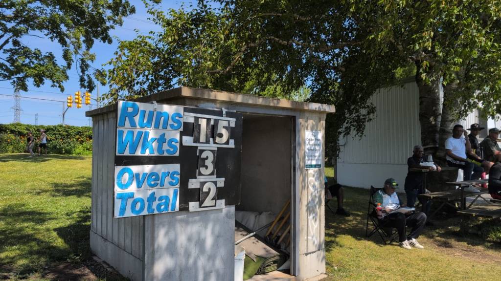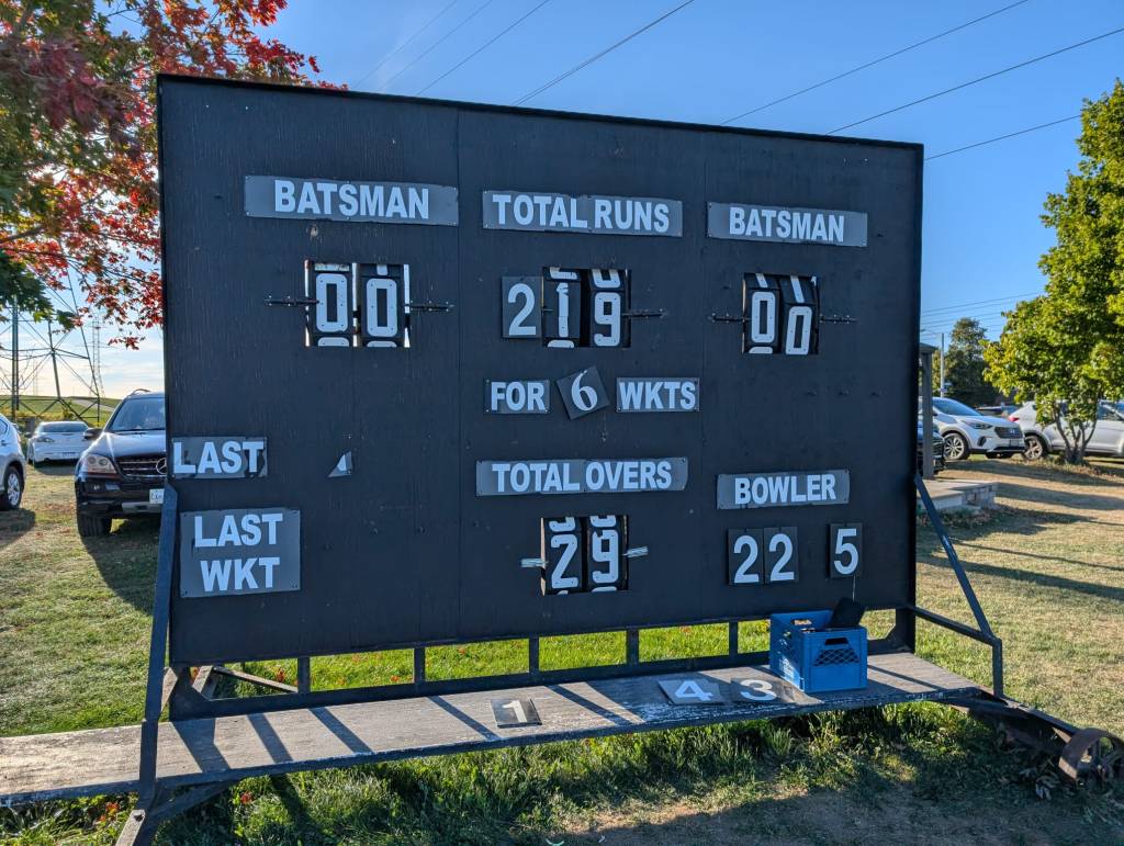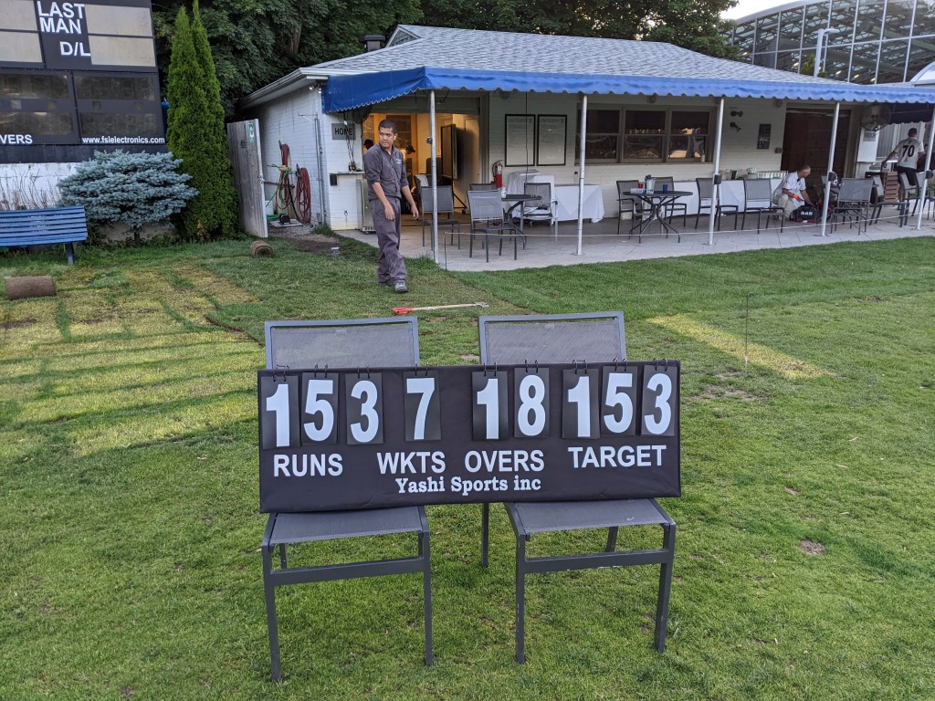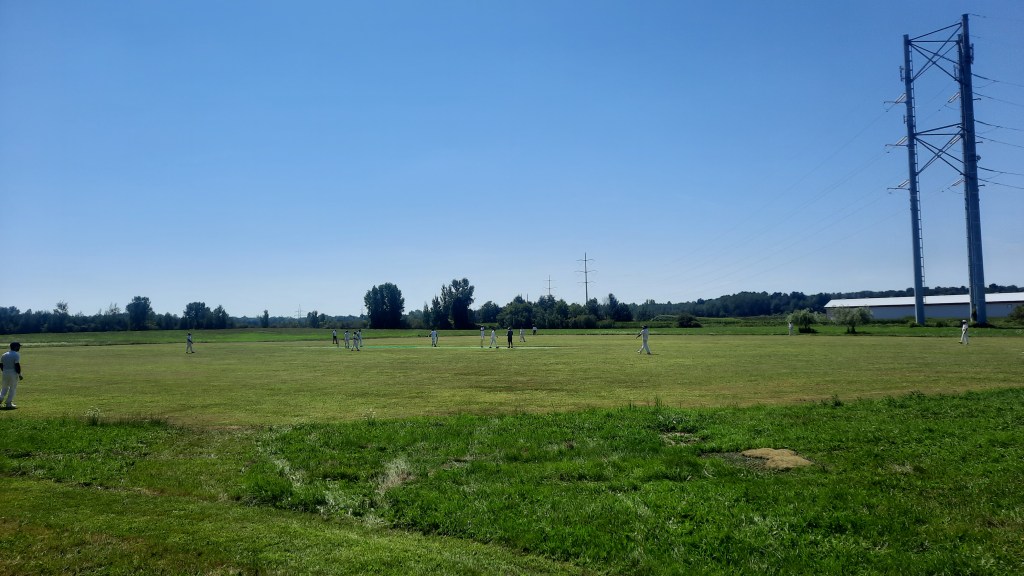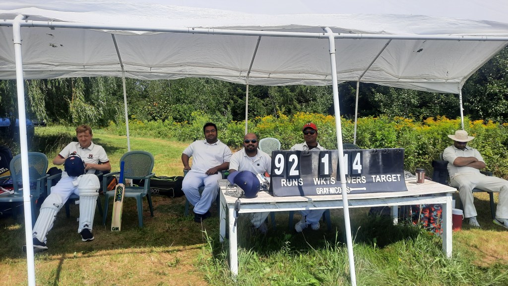 Nightwatchmen CC followed their voyage up the St Lawrence to Montreal with a lift up the Trent-Severn waterway to play Peterborough Phoenix CC for the first time since a tri-series match in Markham in 2017(?). The ground sits in a public park with the wicket located between two soccer fields. The astroturf is in excellent condition and with the Nightwatchmen winning the toss they decided to bat first. The initial batting was tough going with the team quickly reaching 9-2. Martin and Gandhi settled things down with a stalwart test-match like innings from Martin (15 off 44 balls) and a scratchy but persistent innings by Gandhi (28 off 28 balls) which ended with a huge 6 over mid-wicket.