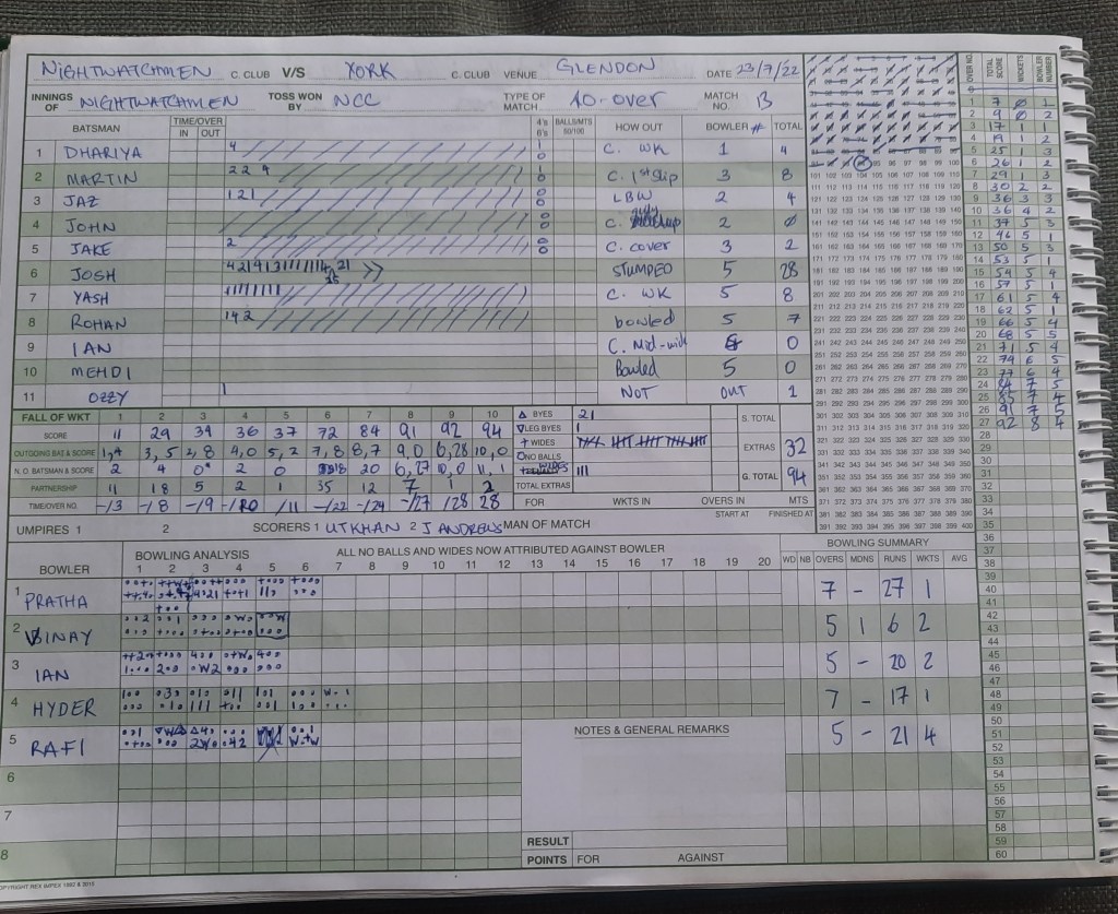 Turns out the pitch was completely fine as York CC knocked off the 94 runs in record time with openers Shawn (27*) and Sahil (43) only requiring assistance from extras (26) to win the game.