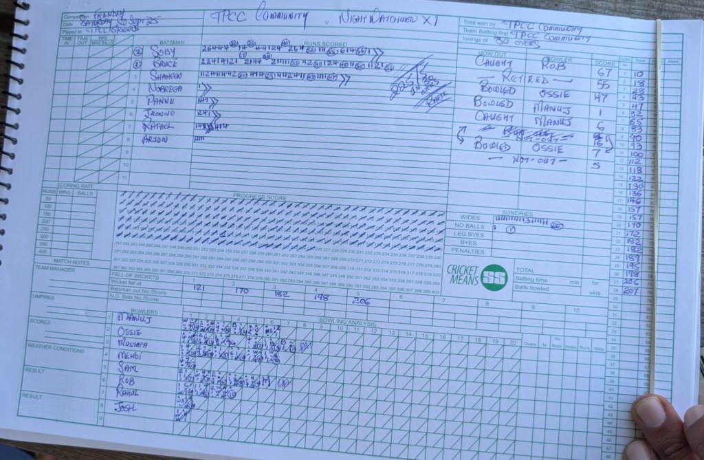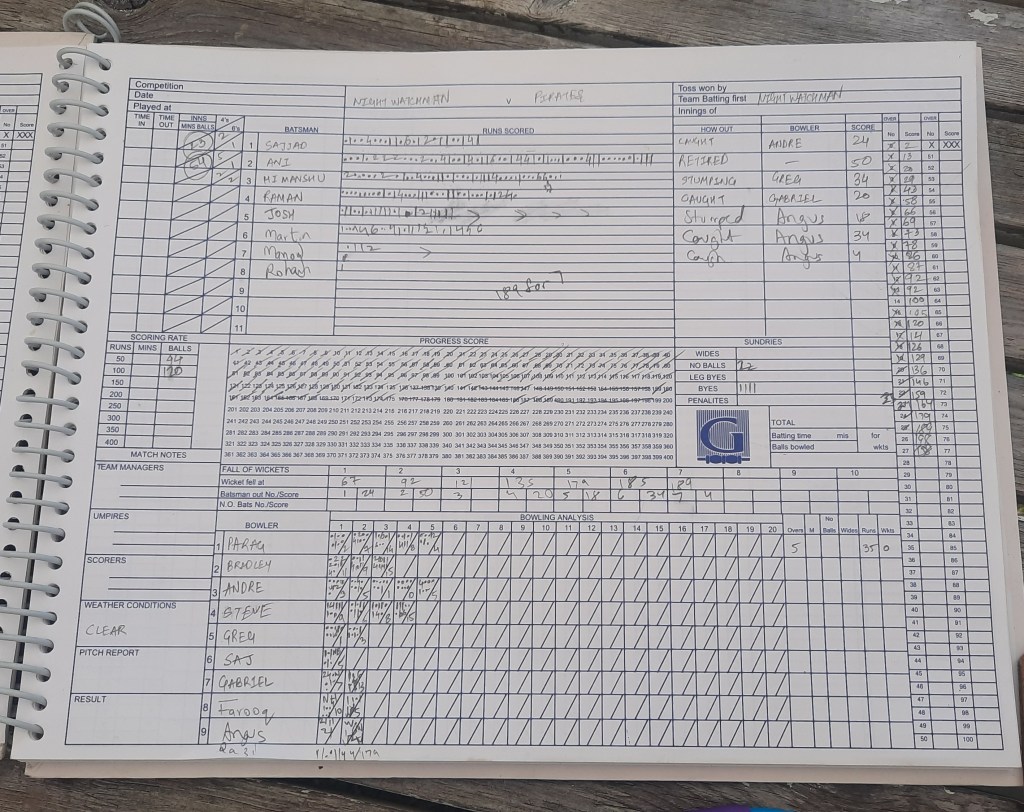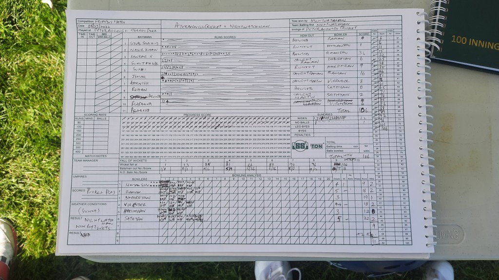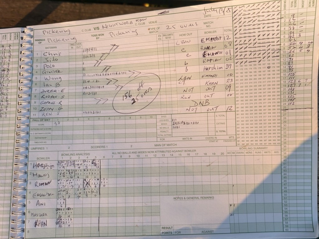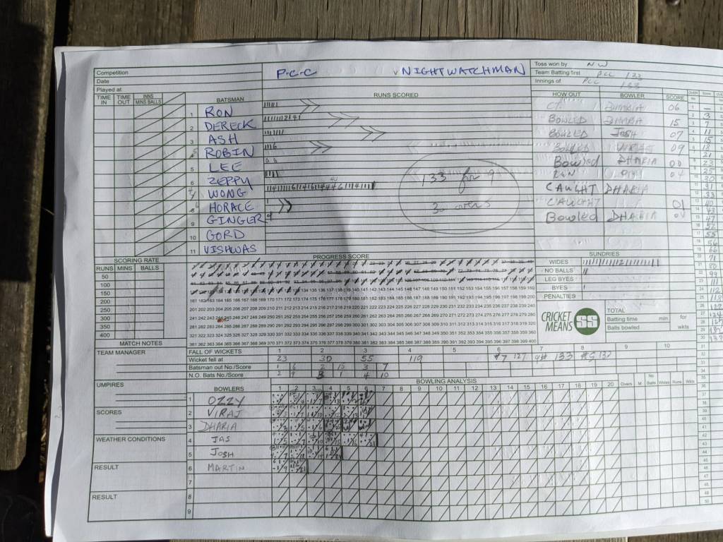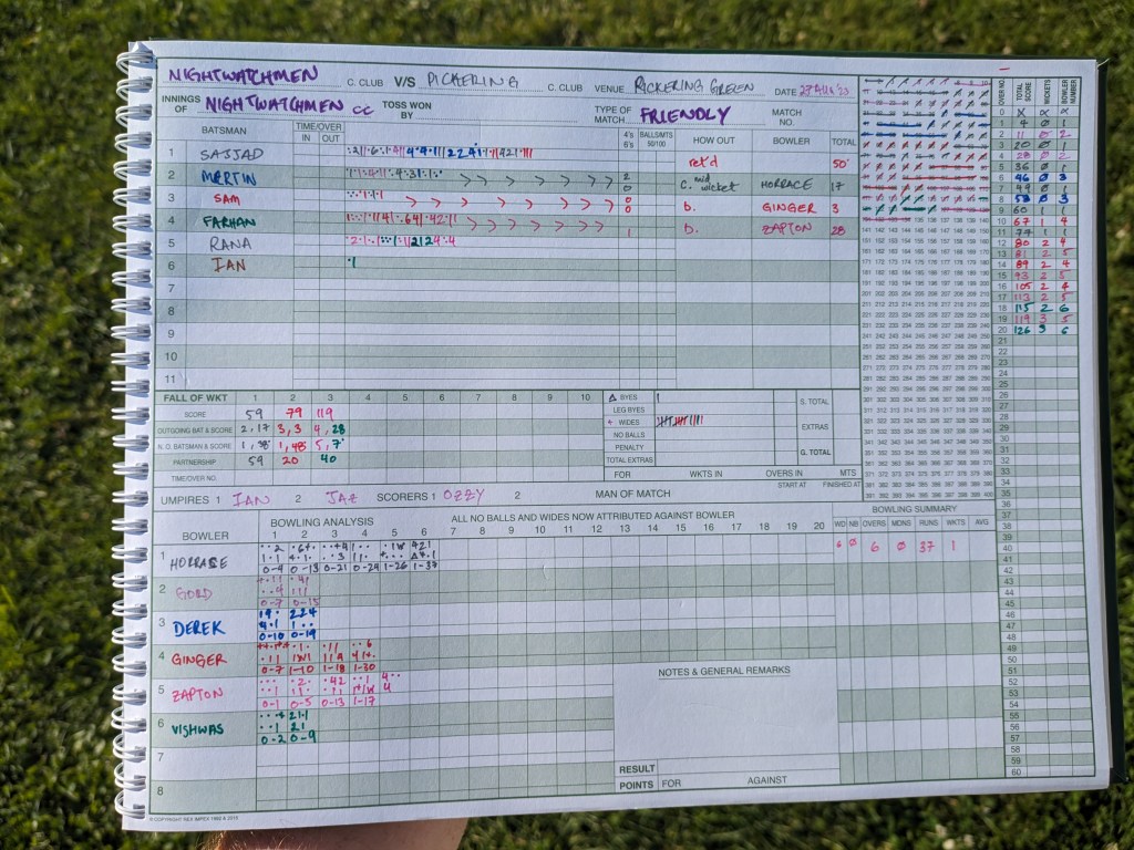 The wicket changed the innings and Nightwatchmen managed to restrict Pickering to 133/8 off 30 overs. The standout bowler was Dhairya Patel who returned figures of 6-0-30-5. Only the second 5 wicket haul in Nightwatchmen history and all in the space of 2 weeks.