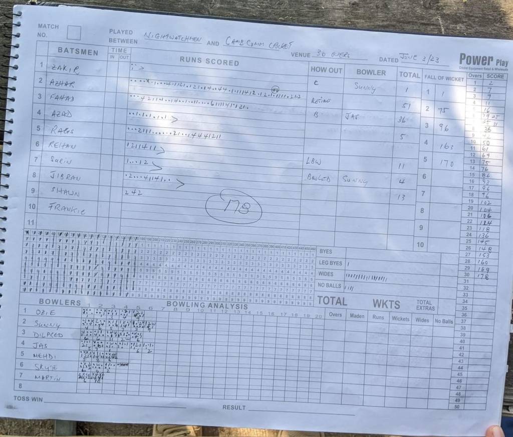 The Nightwatchmen played their second match of the 2023 season against Cambridge CC in Cambridge, Ontario. On a perfect morning for cricket, and after a late start, The Nightwatchmen were put into field by Cambridge having lost the toss. The Nightwatchmen bowlers started the innings well, restricting Cambridge to 16 runs after 5 overs, and 50 after 10. Azhar and Fahad, playing for Cambridge, put on a long partnership for the second wicket, with Azhar retiring after scoring an important 51, and Fahad bowled by Jas scoring 36. The Nighwatchmen, helped by some tidy bowling by Jas, Sunny, Mehedi, and Ozzy, restricted Cambridge to 104 after 20 overs, taking wickets regularly. However, Cambridge accelerated in the last 10 overs, ending up on 178/5 after 30 overs, helped by 17 wides.