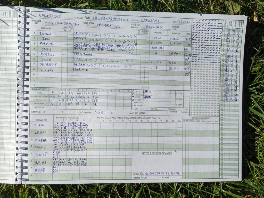 The Nightwatchmen had a shaky start, losing early wickets after 6 (Rohan out for 3) and 10 (Ian out for 1) runs after 4 overs. However, Farhan and Yash put on an excellent 109 run partnership for the third wicket, taking the team to 119/3 at the end of 21 overs. With 60 runs needed off the last 9 overs, it seemed like a straightforward first victory of the season was on the cards. Nevertheless, the captain Sykes managed to run out the star batter and after a series of quick wickets for Cambridge followed (Yash, Josh, and Dilpreet were out cheaply), the equation looked a bit more difficult. However, Sunny, coming in at number eight as the finisher, expertly hit two sixes and a four, to comfortably guide The Nightwatchmen to a 4-wicket win.