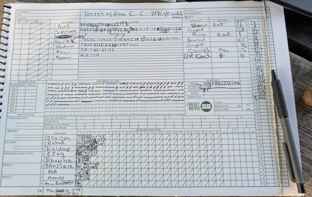 The Nightwatchmen kicked off their first match of the 2022 season versus the Toronto Cricket Skating and Curling Club on 10 June 2022 – a 20-over pink ball match. A perfect day for cricket, stand-in captain Ozzy Khan won the toss, and after a brief consultation with the team, elected to bowl first. NCC kept Toronto Cricket Club scoring in check for the first 8-overs, only conceding 47 runs after 8 overs, thanks to tidy bowling by Fenil and Patel. The first breakthrough came via a run out of Duncan in the 9th over, after which Toronto Cricket Club accelerated their scoring. Graham (Toronto Cricket Club) retired after scoring 42*, after which Cheema (Toronto Cricket Club) hit a blistering 40*, with wickets falling regularly each over. Ani played an important cameo – bowling at the death and picking up two wickets to restrict Toronto Cricket Club to 152 runs. Anis and Rana both kept wicket (10 overs each), with Rana taking three excellent catches behind the stumps to cement his place as the regular wicketkeeper of the team.