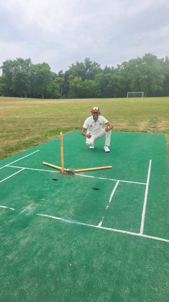 After probably the longest pre-match fielding practice completed in club history (15 minutes?) the players took to the field and walked towards their favourite fielding positions. TCSCC started calmly and positively with a fine 57 run opening partnership – both batters playing well. The pitch offered some assistance and it was a return to bowling for NCC’s ex-opening-bowler-turned-opening-batter Viraj. Viraj bowled some beautiful inswingers with one ball taking the edge of the bat to the safe hands of NCC’s part-time wicketkeeper. More accurate bowling by Viraj captured a second wicket this time bowled through the gate. Two further wickets reduced TCSCC to 70-4 with Sam persevering in a seven over spell to take one wicket and catch one with a solid take on the deep midwicket boundary off of Jake’s bowling.