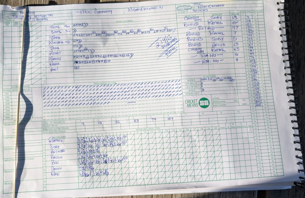 Nightwatchmen CC bowling was immediately on the mark with Viraj picking up two early wickets with some accurate swing bowling. At the other end Manoj kept the pressure on TCC with a fine spell of bowling. The opening bowlers were backed up by Ani, Raman and Sam who kept the run rate below 5 per over. Josh picked up his first wicket of the season getting Rafaan caught at mid-on by Manoj. The stand-in wicketkeeper dropped only 3 catches but questions remain over his position in the team and selection debates roll on.